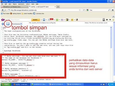 Setelah semuanya telah anda ganti (untuk lebih jelasnya lihat gambar diatas) dan anda benar-benar yakin dengan apa yang barusan anda lakukan maka tekan tombol disketnya untuk menyimpan wp-config.php.